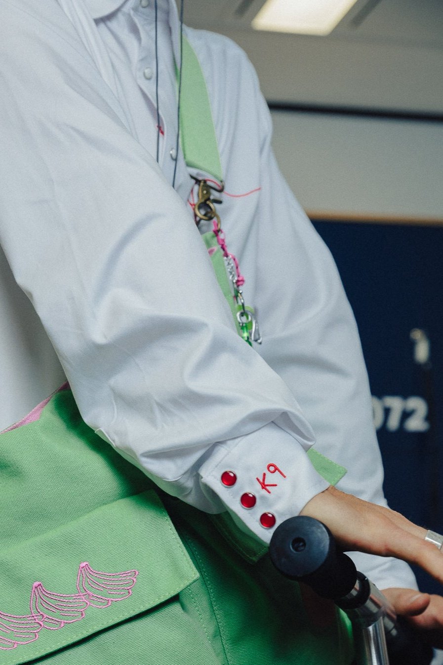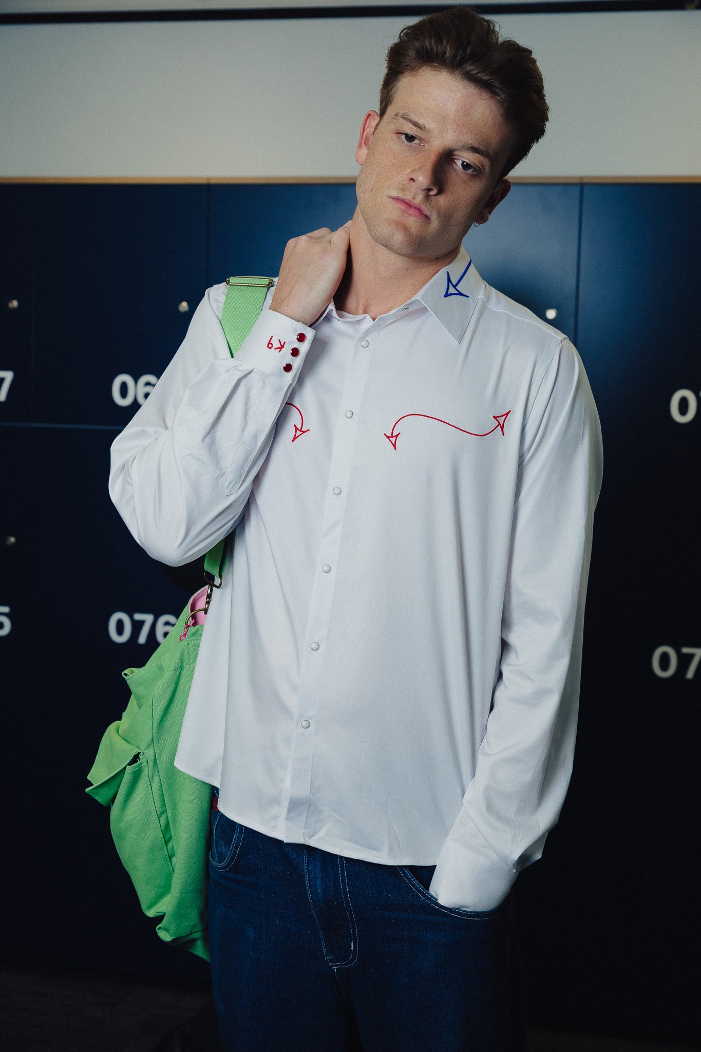 Red and blue hand-drawn embroidered arrows, plus some thought provoking words on the back shoulder