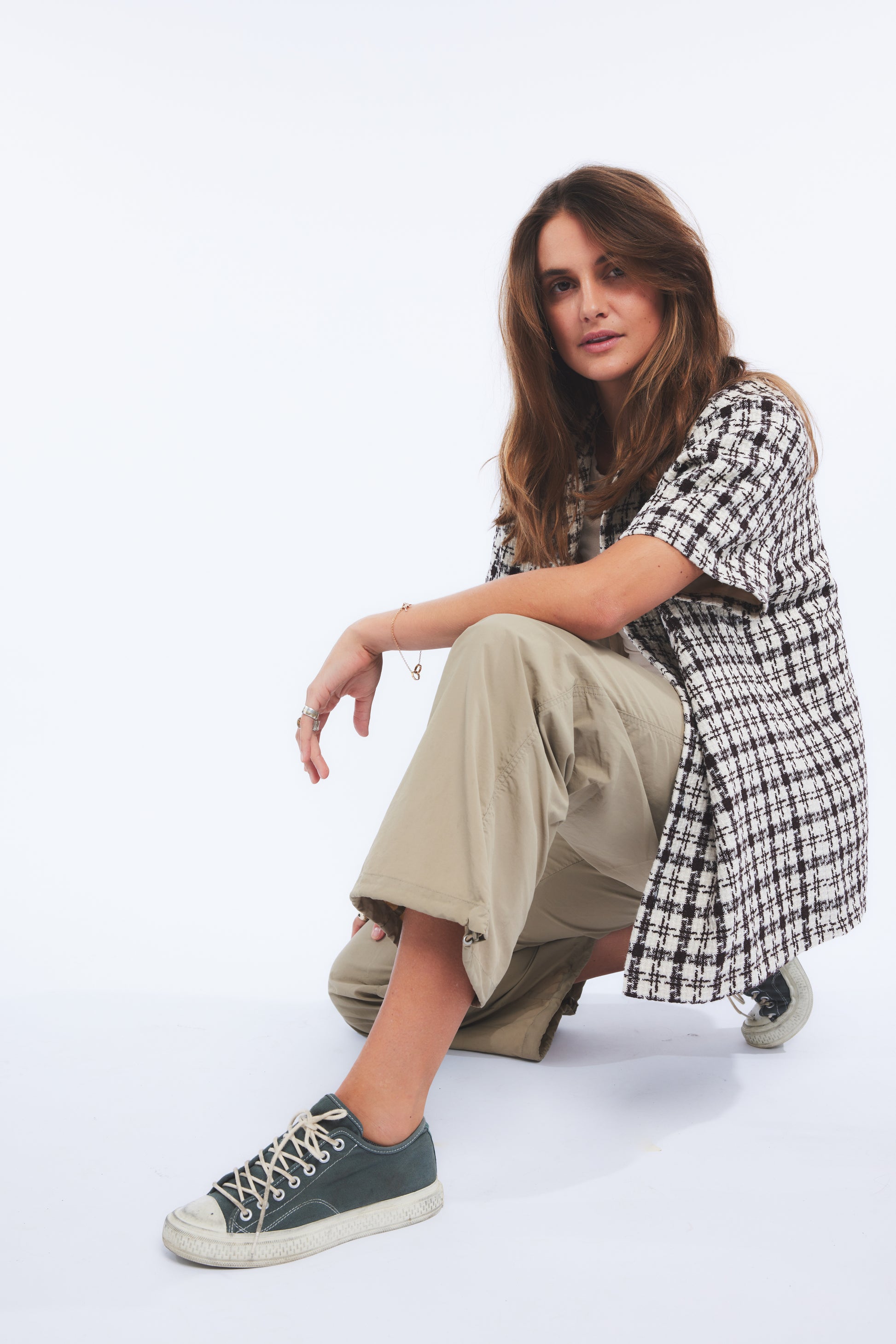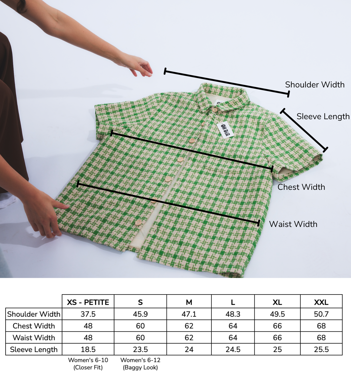 Julia wears an XS - PETITE for a closer fit and a S for the oversized look. Height 180cm. Chest 82cm. Waist 62cm.