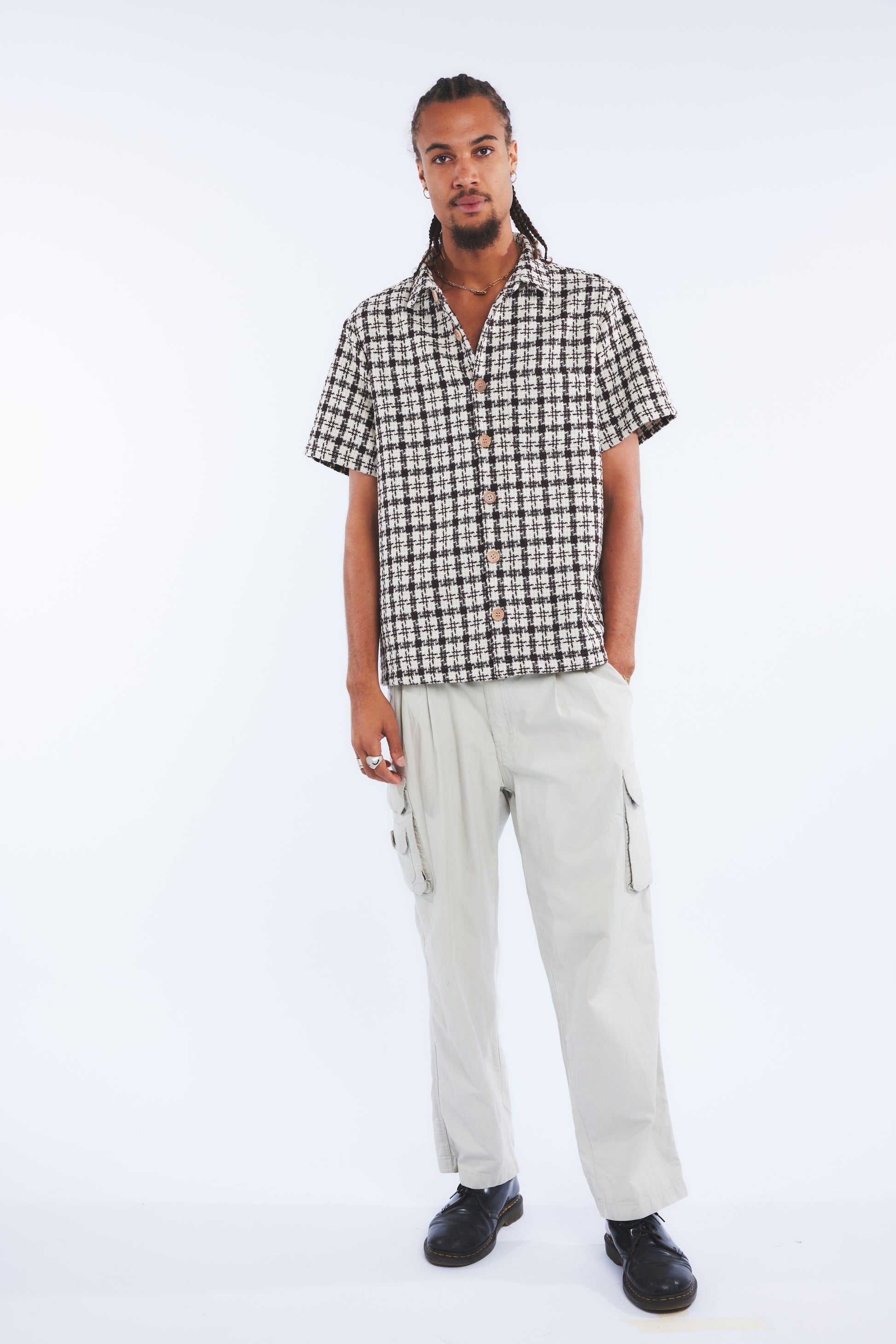 Heavyweight woven material in brown and cream to be dressed up and dressed down.